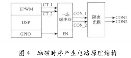 勵(lì)磁時(shí)序產(chǎn)生電路用于產(chǎn)生勵(lì)磁控制信號(hào)CON1和CON2以控制方波勵(lì)磁時(shí)序,其電路原理結(jié)構(gòu)圖如圖4所示。