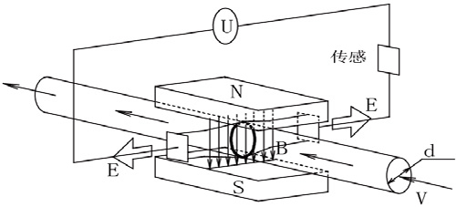 如圖,測量流量時(shí),流體流過垂直于流動(dòng)方向的磁場,導(dǎo)電性流體的流動(dòng)感應(yīng)出一個(gè)與平均流速成正比的電勢。其感應(yīng)電壓信號(hào)通過兩個(gè)電*檢出,并通過電纜傳送至轉(zhuǎn)換器,經(jīng)過信號(hào)處理及相關(guān)運(yùn)算后,將累計(jì)流量和瞬時(shí)流量顯示在轉(zhuǎn)換器的顯示屏上。