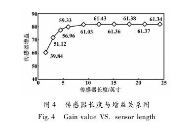 采用一臺(tái)日徑為6英寸、標(biāo)準(zhǔn)線圈的傳感器,改變傳感器長(zhǎng)度,依次進(jìn)行試驗(yàn)室標(biāo)定試驗(yàn)。傳感器長(zhǎng)度與增益的關(guān)系圖如圖4所示。當(dāng)傳感器長(zhǎng)度為9. 1英寸時(shí),其增益為61. 03;但當(dāng)其長(zhǎng)度繼續(xù)增加時(shí),增益變化較小;當(dāng)其長(zhǎng)度6. 1英寸減小到0時(shí),增益從59. 33開始下降。也就是說(shuō),當(dāng)傳感器長(zhǎng)度為6. 1-9. 1英寸時(shí),既有效利用了線圈產(chǎn)生的磁場(chǎng),又可使傳感器長(zhǎng)度較短。