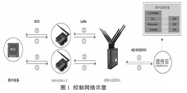 基于 LoRa 技術(shù)的無(wú)線流量計(jì)由控制,計(jì)量,通信,電源,存儲(chǔ)五個(gè)模塊組成。以空調(diào)水流量計(jì)為主體的計(jì)量模塊將采集到的供暖管道數(shù)據(jù)發(fā)送到通信模塊,基于 LoRa 技術(shù)的通信模塊將流量數(shù)據(jù)存儲(chǔ)并且發(fā)送到由管理人員監(jiān)控的控制模塊,管理人員通過(guò)控制模塊和通信模塊向流量計(jì)發(fā)送指示。電源模塊是無(wú)線流量計(jì)的能源中心,可以為流量計(jì)的其他模塊提供動(dòng)力支持。流量計(jì)安裝完畢后可在小區(qū)內(nèi)形成控制網(wǎng)絡(luò),網(wǎng)絡(luò)示意圖如圖 1 所示。