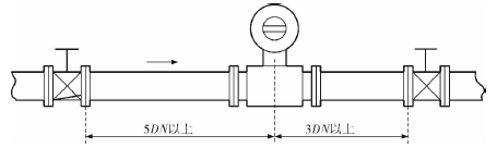 補(bǔ)水流量計(jì)的安裝質(zhì)量對其測量結(jié)果的影響較大,因此在安裝時(shí)需要注意幾個(gè)問題。*先,補(bǔ)水流量計(jì)直管段的選擇在配管時(shí)一定要按照要求進(jìn)行選擇,一般選擇流量計(jì)通徑與工藝管道通徑相同,即可滿足工程需要,而且安裝方便、壓力損失小,流量計(jì)直管段上游側(cè)的長度不少于5倍工藝管道直徑,下游側(cè)的長度不少于3倍工藝管道直徑(圖2)。但在流速太慢而又要求精度較高或需要變徑的應(yīng)用場合,可選擇通徑小于工藝管道通徑的流量計(jì),以提高測量精度,此時(shí)流量計(jì)上、下游必須加裝異徑管,且進(jìn)口異徑管上游側(cè)應(yīng)有長于10倍工藝管道直徑的直管段,下游側(cè)應(yīng)有長于5倍工藝管道直徑的直管段(圖3)。