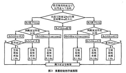 實(shí)際生產(chǎn)中流量一直在某個(gè)區(qū)域內(nèi)波動,且其動態(tài)特性不易掌握。從上面的理論中我們能夠讓誤差△£盡可能的小,這樣距我們所需要的理論值%就越接近。而減小誤差需要我們把n取的盡可能大,也就是在生產(chǎn)時(shí)間內(nèi)劃分更多的周期去調(diào)節(jié)流量。當(dāng)工控機(jī)根據(jù)雙氧水計(jì)量表傳送回來的信號發(fā)出調(diào)節(jié)變頻器工作頻率的指令后,電機(jī)調(diào)整功率到雙氧水計(jì)量表的實(shí)際測量為一個(gè)工作周期,我們知道從指令發(fā)送到實(shí)際測量值返回有一個(gè)較大的滯后,如果調(diào)節(jié)的周期時(shí)間小于流量計(jì)本身的一個(gè)工作周期,那么顯然不可能達(dá)到減小誤差的目的。利用模糊控制思想H。,在控制程序中我們把流量的波動區(qū)域劃分為±缸×Yo,Yo-t-O.3,Yo±0.5四個(gè)區(qū)域,其中缸為可調(diào)節(jié)的誤差范圍,生產(chǎn)中我們?nèi)?.015,流量區(qū)域劃分的單位均為t/h。針對不同的區(qū)域采取不同的調(diào)整方案。具體流程如圖3所示。圖中變量Rel表示實(shí)際測量的流量,變量Idea表示理論流量。