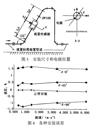 3)電磁流量傳感器在彎管下游即使有足夠長(zhǎng)(5D)的直管段,亦應(yīng)按“45°安裝”,作為減小彎管撓流影響,降低附加誤差的措施。