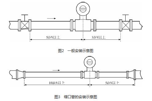砂漿流量表的安裝質(zhì)量對其測量結(jié)果的影響較大,因此在安裝時需要注意幾個問題。*先,砂漿流量表直管段的選擇在配管時一定要按照要求進行選擇,一般選擇流量計通徑與工藝管道通徑相同,即可滿足工程需要,而且安裝方便、壓力損失小,流量計直管段上游側(cè)的長度不少于5倍工藝管道直徑,下游側(cè)的長度不少于3倍工藝管道直徑(圖2)。但在流速太慢而又要求精度較高或需要變徑的應(yīng)用場合,可選擇通徑小于工藝管道通徑的流量計,以提高測量精度,此時流量計上、下游必須加裝異徑管,且進口異徑管上游側(cè)應(yīng)有長于10倍工藝管道直徑的直管段,下游側(cè)應(yīng)有長于5倍工藝管道直徑的直管段(圖3)。