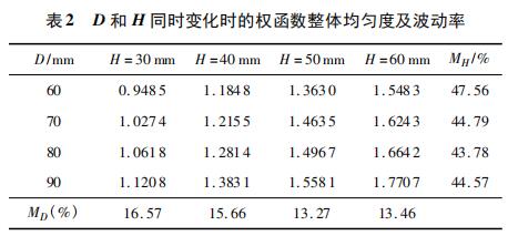 計(jì)算多組相同 D × H、不同 L 時(shí) xy 平面的權(quán)函數(shù)整體均勻度 R 及波動率 ML,如表 1 所示。