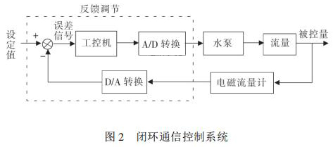 通信控制系統(tǒng)由工控機、變頻器、水泵、數(shù)據(jù)采集卡、熱水流量計等組成。在整個熱量表耐久性試驗裝置中,熱水流量計與被試驗熱量表串聯(lián)在試驗管路中。系統(tǒng)設(shè)定流量值 qs,通過工控機發(fā)送信號給變頻器,來控制水泵運轉(zhuǎn),系統(tǒng)通過研華數(shù)據(jù)采集卡 PCI1711 將采集到的熱水流量計當前瞬時流量值反饋給工控機,工控機將返回流量值與設(shè)定流量值qs進行比較,從而確定是否需要重新調(diào)整變頻器頻率控制水泵轉(zhuǎn)速。此過程是一個完整的閉環(huán) PID 控制過程,其閉環(huán)控制過程如圖 2 所示。 2. 2 管路切換系統(tǒng)管路切換主要由冷熱水箱、水泵、開關(guān)閥等組成。要實現(xiàn)熱量表耐久性 4000 次冷熱沖擊試驗,需要實時控制管路中熱水與冷水的交替使用。