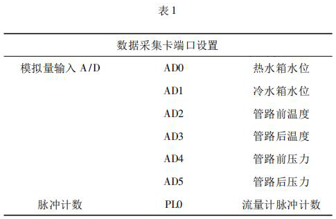 數(shù)據(jù)采集系統(tǒng)由工控機、熱水流量計以及數(shù)據(jù)采集卡組成。 4000 次冷熱沖擊試驗要求在在*大流量 qs 條件下運行,對流量數(shù)據(jù)的采集用到熱水流量計及數(shù)據(jù)采集卡。熱水流量計采集管路流量,數(shù)據(jù)采集卡將熱水流量計采集到的數(shù)據(jù)反饋給工控機系統(tǒng)。過程中,試驗管路水溫以及水箱水位的采集控制也是通過數(shù)據(jù)采集卡反饋給系統(tǒng)控制。試驗過程用到的數(shù)據(jù)采集卡采用研華生產(chǎn)的PCI - 1711。PCI - 1711 是一款多功能 PCI 總線數(shù)據(jù)采集卡,具有 16 路單端模擬量輸入功能、2 路 12位模擬量輸出功能、16 路數(shù)字輸入和 16 路數(shù)字輸出功能、計數(shù)器功能等。為保證冷熱沖擊試驗結(jié)果的準確性,嚴要求嚴格控制管路流量以及管路壓力。因此,管路設(shè)置前后管路溫度、冷熱水箱水位以及管路壓力的采集,管路流量根據(jù)熱水流量計脈沖計數(shù)進行采集,其數(shù)據(jù)采集卡端口設(shè)置如表 1 所示。