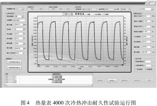 本文研究的 4000 次冷熱沖擊試驗的實現(xiàn)具有以下特點: (1)基于“工控機 +水泵 + 熱水流量計”的閉環(huán)控制系統(tǒng),實現(xiàn)了流量自動反饋調(diào)節(jié),滿足試驗要求; (2)通過四個開關(guān)閥的時序切換,自動控制試驗溫度,很好的完成了 4000 次溫度沖擊試驗; (3)通過“工控機 + 數(shù)據(jù)數(shù)據(jù)采集卡”的數(shù)據(jù)采集系統(tǒng),實時監(jiān)控試驗過程中的流量、溫度、壓力等相關(guān)參數(shù),實現(xiàn)試驗方式的自動控制,并能對試驗數(shù)據(jù)進行分析與評定。 (4)試驗的全過程為智能自動化,可無人員留守看護。試驗結(jié)果可直接反映出熱量表在長時間運行后的可靠性。為我國熱量表耐久性試驗研究提供檢測手段,為促進產(chǎn)品質(zhì)量提升做好技術(shù)保障。