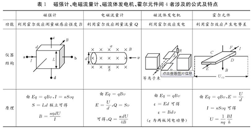 易錯點2:磁強計、鍋爐熱水流量計、磁流體發(fā)電機、霍爾元件間的區(qū)別與聯(lián)系磁強計、鍋爐熱水流量計、磁流體發(fā)電機、霍爾元件都是利用電磁場對帶電粒子的偏轉(zhuǎn)效應(yīng),并且穩(wěn)定時電場力與磁場力均達(dá)到平衡。很多學(xué)生容易將其混淆,遇到問題常常搞不清原理,亂代公式,筆者特將4者涉及的公式及特點等做一對比區(qū)別如表1所示。