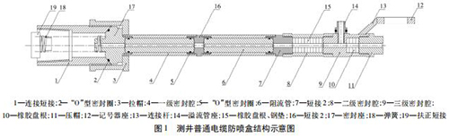 注入剖面測(cè)試中,溢流量對(duì)測(cè)量結(jié)果影響至關(guān)重要。如圖 1 所示,測(cè)井普通防噴盒采用 3 級(jí)密封: * 1 級(jí)密封為阻流管( 6) ,測(cè) 20 井次左右阻流管內(nèi)徑變大,溢流量增加; * 2 級(jí)為橡膠盤根和鋼墊( 15) ; * 3 級(jí)為橡膠盤根( 10) ,調(diào)整壓帽( 11) 松緊程度,橡膠盤根抱緊電纜; * 2 級(jí)和* 3 級(jí)密封更換一次橡膠盤根測(cè)試 3 ~ 5 井次溢流量增加。普通防噴盒無(wú)法實(shí)現(xiàn)溢流量,沒(méi)有捕捉器、防噴器和放噴組裝件。普通電纜防噴裝置工作壓力20 MPa,耐壓 40 MPa。