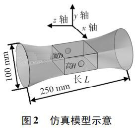 使用 Pro /E 軟件建立三維幾何模型,導(dǎo)入 COMSOL 軟件進(jìn)行有限元求解。仿真模型如圖 2 所示,電*連線為x 軸,連線中點(diǎn)為坐標(biāo)原點(diǎn),流體運(yùn)動方向?yàn)?z 軸,傳感器管道口徑為 DN100,總長250 mm。異徑管部分初始結(jié)構(gòu)尺寸 L = 80 mm,D = 80 mm,H = 40 mm,圓形電*半徑為17 mm,伸出絕緣襯里的*大距離為 1. 5 mm。
