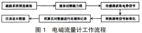 冷水流量計(jì)的產(chǎn)生主要是基于法拉*電磁感應(yīng)定律。在冷水流量計(jì)的應(yīng)用中,磁路系統(tǒng)會(huì)在流量計(jì)運(yùn)行過程中逐步出現(xiàn)直流磁場與交流磁場,該磁場的產(chǎn)生為后期的測量提供了良好的前提條件,營造了測量所需的磁場環(huán)境,因此,在冷水流量計(jì)應(yīng)用時(shí),一旦被測液體在導(dǎo)管中經(jīng)過該磁場環(huán)境時(shí),必然會(huì)產(chǎn)生一定的切割磁力線運(yùn)動(dòng),在這種情況下,電*傳感器就會(huì)發(fā)揮其作用,將導(dǎo)管內(nèi)的流量轉(zhuǎn)換為感應(yīng)電勢信號(hào),隨后此轉(zhuǎn)換形成的信號(hào)逐步被傳遞給轉(zhuǎn)換器。而轉(zhuǎn)換器更是可以將所獲得的流量信號(hào)等加以處理,通過分析、對(duì)比等,轉(zhuǎn)換器會(huì)將該信號(hào)變?yōu)闃?biāo)準(zhǔn)信號(hào),隨后將該信號(hào)輸出給積算儀,進(jìn)一步進(jìn)行信號(hào)的處理,這些處理以后的信號(hào)*終會(huì)在冷水流量計(jì)的儀表中顯示,呈現(xiàn)*終的流量測量結(jié)果,其基本的流程如圖 1 所示。