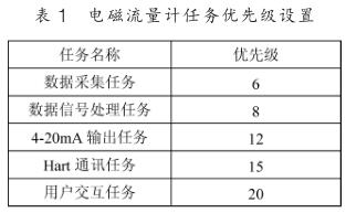 下面以電磁流量計(jì)為例說明基于 μC/OS-III 的人機(jī)界面設(shè)計(jì)。 先將 μC/OS-III 移植到 Cortex-M3 處理器上,這里選用的是 STM32F103VET6 。電磁流量計(jì)的應(yīng)用程序若按照上節(jié)的任務(wù)種類劃分有: 數(shù)據(jù)采集任務(wù)、數(shù)據(jù)處理任務(wù), 4~20mA輸出任務(wù), Hart 通訊任務(wù)以及用戶交互任務(wù)。 先對不同的任務(wù)進(jìn)行優(yōu)先級的劃分,如表 1 所示。