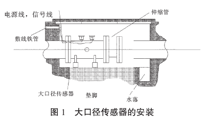 由于自來(lái)水行業(yè)的特點(diǎn),管網(wǎng)中運(yùn)行的大口徑傳感器基本安裝在井內(nèi),井內(nèi)容易積水或滲漏水,使傳感器接線盒內(nèi)受潮,導(dǎo)致計(jì)量不準(zhǔn)確,即使防護(hù)等級(jí)為IP68的傳感器,也常出現(xiàn)該問(wèn)題。要拆除原有接線盒內(nèi)膠封,重新制作膠封,是實(shí)踐中常用的方法之一。所以,在安裝大口徑傳感器之前必須要做好相對(duì)應(yīng)的傳感器井。給排水系統(tǒng)中常見(jiàn)的安裝形式如圖1所示。傳感器井應(yīng)有足夠的活動(dòng)空間,側(cè)壁埋有敷設(shè)電纜的鋼管,上有蓋板防止雨淋,下有泄水以免坑內(nèi)積水而使傳感器浸水。傳感器應(yīng)放在專(zhuān)用支撐架,在出水側(cè)裝有活絡(luò)的伸縮管。