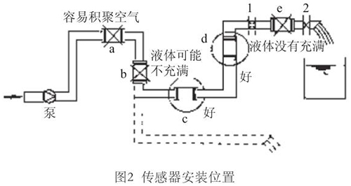 液體流動方向必須與傳感器殼體上箭頭方向一致。對于能正反向測量的生活污水計量表,若方向不一致雖仍可測量,但設定的顯示流動正反方向不符,必須改正之。若拆傳感器工作量大,也可改變傳感器上箭頭方向和重新設定顯示儀表符號。管道未充滿液體主要是管網(wǎng)工程設計或傳感器安裝位置不妥,使傳感器測量管內不能充滿液體。應采取措施,避免安裝如圖2所示a,e位置和以虛線管排放時b位置,改裝到c,d位置。