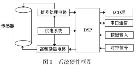 高頻勵(lì)磁電鍍污水計(jì)量表由傳感器、高頻勵(lì)磁電路、信號(hào)處理電路等組成,其中高頻勵(lì)磁電路決定著傳感器磁場(chǎng)的強(qiáng)弱,勵(lì)磁電路的穩(wěn)定性以及精確性決定著系統(tǒng)檢測(cè)的準(zhǔn)確性以及穩(wěn)定性。DSP 系統(tǒng)控制勵(lì)磁電路激勵(lì)傳感器線圈,當(dāng)線圈中有導(dǎo)電液體流過(guò)時(shí),其切割磁感線并在傳感器兩端的線圈上產(chǎn)生感應(yīng)電動(dòng)勢(shì),利用信號(hào)檢測(cè)電路監(jiān)測(cè)感應(yīng)電動(dòng)勢(shì)的大小,*后根據(jù)相應(yīng)關(guān)系計(jì)算出液體的流量,系統(tǒng)硬件框圖如圖 1 所示。