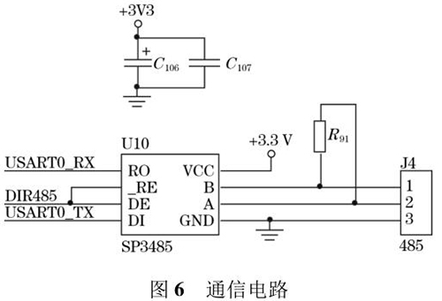 電鍍污水計(jì)量表輸出的流量值可以通過(guò)外接的 TFTLCD 屏直接顯示,還可以通過(guò)預(yù)留的 RS485 通信接口將數(shù)據(jù)發(fā)送到上位機(jī)中。RS485 電路*大的優(yōu)點(diǎn)是 485 電平與 TTL 電平兼容,方便與 TTL 電路相連;抗共模干擾能力強(qiáng);數(shù)據(jù)傳輸速度快,高達(dá) 10 Mbps;通信距離遠(yuǎn),*大為 1.2 km。系統(tǒng)采用 SP3485 芯片進(jìn)行數(shù)據(jù)通信,SP3485 是一款低功耗芯片且符合RS485 協(xié)議的收發(fā)器,電路圖如圖 6 所示。