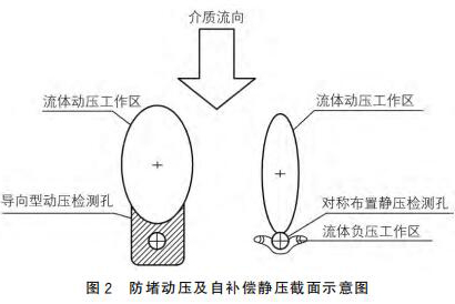 新給水管流量計(jì)采用拋物面導(dǎo)向型結(jié)構(gòu)作為動(dòng)壓測(cè)點(diǎn),采用對(duì)稱自補(bǔ)償型式的靜壓測(cè)點(diǎn),可以有效地解決來(lái)流方向偏流時(shí)信號(hào)的穩(wěn)定采集,來(lái)流偏離管道軸線時(shí),可以維持輸出差壓基本不變,如圖2所示。