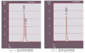 對振動采集器獲取的信號進行譜分析,海水流量計組運轉(zhuǎn)狀態(tài)下主要振動頻率為11.33Hz和12.38Hz,其中12.38Hz為海水流量計轉(zhuǎn)動頻率;停運時,12.38Hz的海水流量計轉(zhuǎn)頻消失,11.33Hz的外部激擾力依然存在。