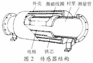 測(cè)酸堿水流量計(jì)由流量傳感器和轉(zhuǎn)換器兩部分組成。傳感器典型結(jié)構(gòu)示意如圖2,測(cè)量管上下裝有激磁線圈,通激磁電流后產(chǎn)生磁場(chǎng)穿過測(cè)量管,一對(duì)電*裝在測(cè)量管內(nèi)壁與液體相接觸,引出感應(yīng)電勢(shì),送到轉(zhuǎn)換器。激磁電流則由轉(zhuǎn)換器提供。