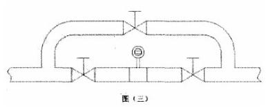 5.被測(cè)介質(zhì)是嚴(yán)重污濁液體過(guò)容易在管道結(jié)垢的液體,可以在安裝傳感器的測(cè)量管道上加一個(gè)旁通管,以便于拆卸清洗。如圖三所示。
