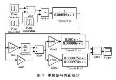 電*上的感應(yīng)電動勢在沒有經(jīng)過放大之前一般很小, 取值在幾毫伏到幾百毫伏之內(nèi),本次仿真中流速感應(yīng)電勢取 10mV。放大器的輸入電阻遠(yuǎn)遠(yuǎn)大于內(nèi)阻,文獻(xiàn)中給出電荷傳遞電阻為 Rs=50Ω。 電*接觸電阻與溶液電導(dǎo)率有關(guān)一般取 Rt=15kΩ。雙電 層 電 容 C1=20μF。 將各參數(shù)值代入到式(7)中,可得 k1=0.998,T1=0.001,T=9.9×10-4。 理想情況兩個電*參數(shù)取值相等, 實際中兩者會存在差異對于電* B 可 取 K1=0.997,T1=9.75×10-4,T2=9.74×10-4。