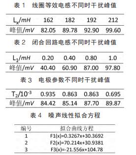 仿真試驗中,設(shè)定線圈等效電感取值范圍為 162~212mH,間隔 10mH;閉合回路等效電感范圍 0.2~1mH,間隔為 0.2mH;雙電層電容、接觸電阻隨流體電導(dǎo)率變化而變化,電導(dǎo)率增大接觸電阻和雙電層電容減小而電荷傳遞電阻增大。可設(shè)定電*接觸電阻、雙電層電容和電荷傳遞電阻范圍分別為 5~15kΩ、10~20μF 和50~60Ω,由公式(7)知,可用 T2 表示上述三者關(guān)系。 仿真參數(shù)取值不同情況下,通過 MATLAB 工具箱對仿真測量得到的干擾峰值進(jìn)行曲線擬合畫出相應(yīng)的曲線圖。 其中仿真數(shù)據(jù)和相對應(yīng)的曲線方程如表 1~表 4 所示,曲線圖如圖 4~圖 6。